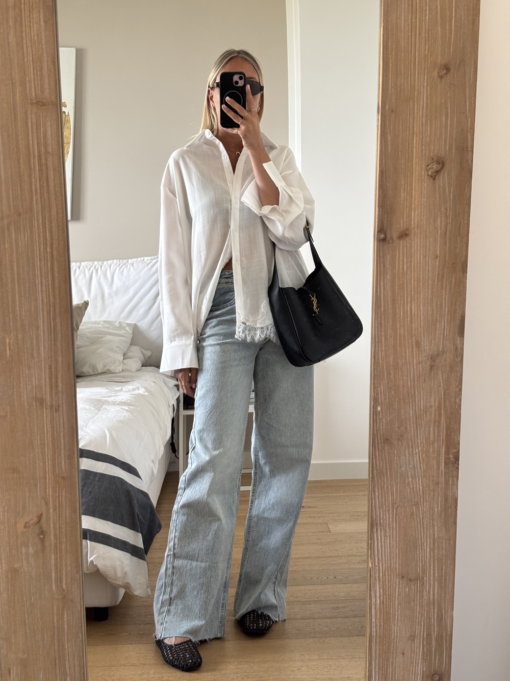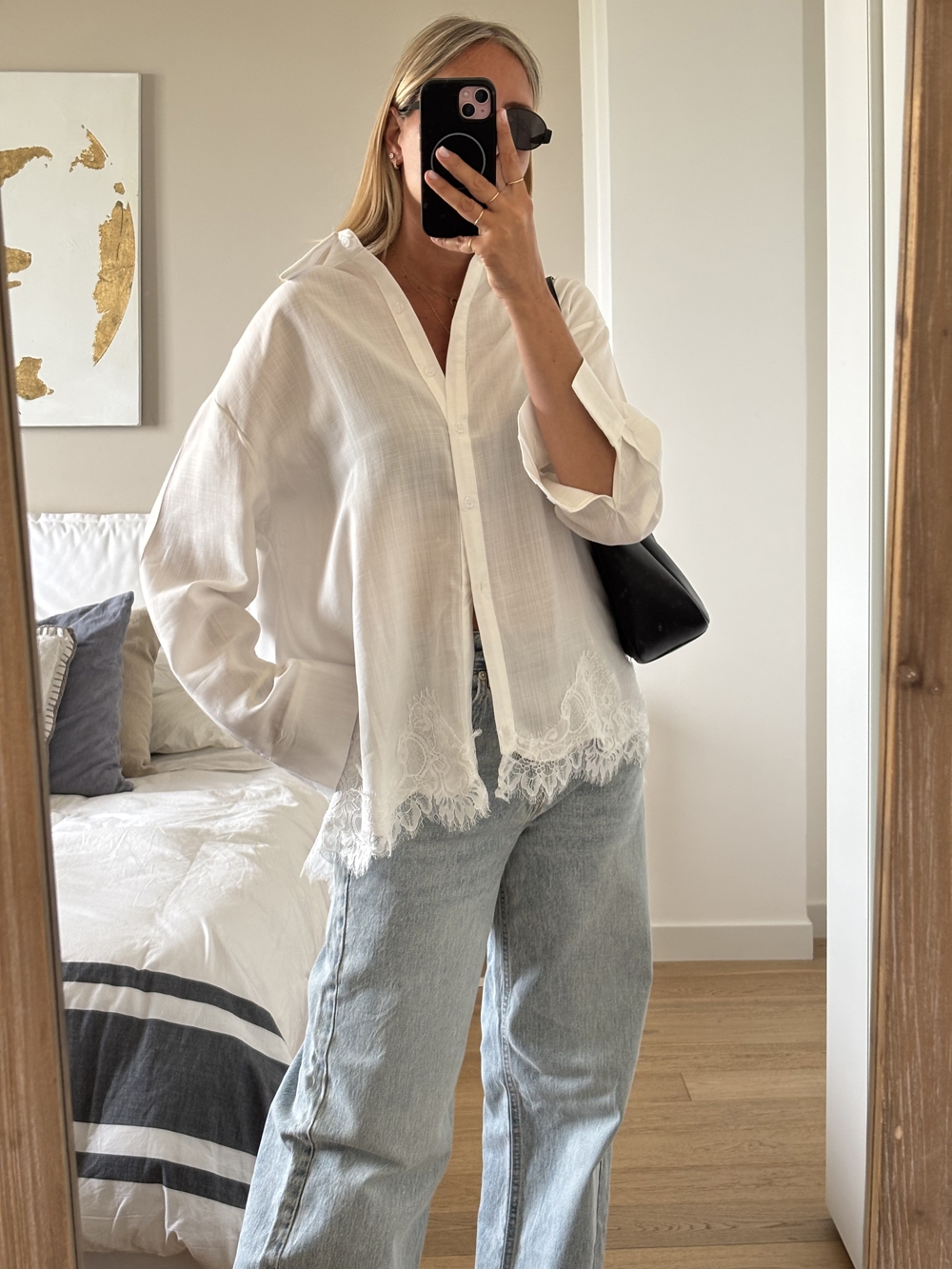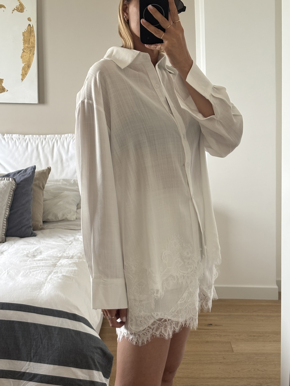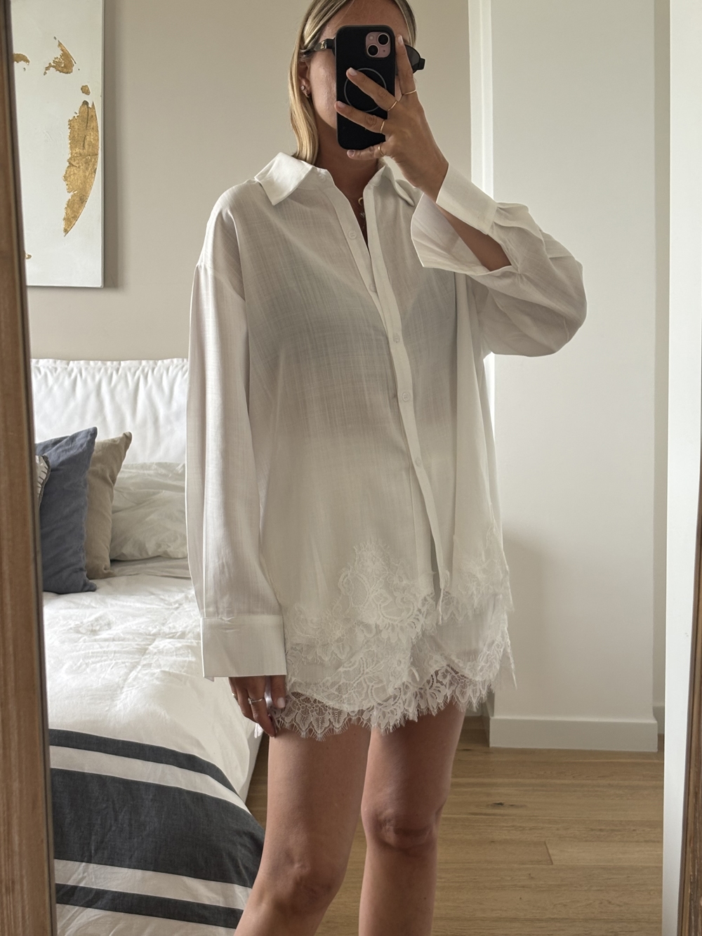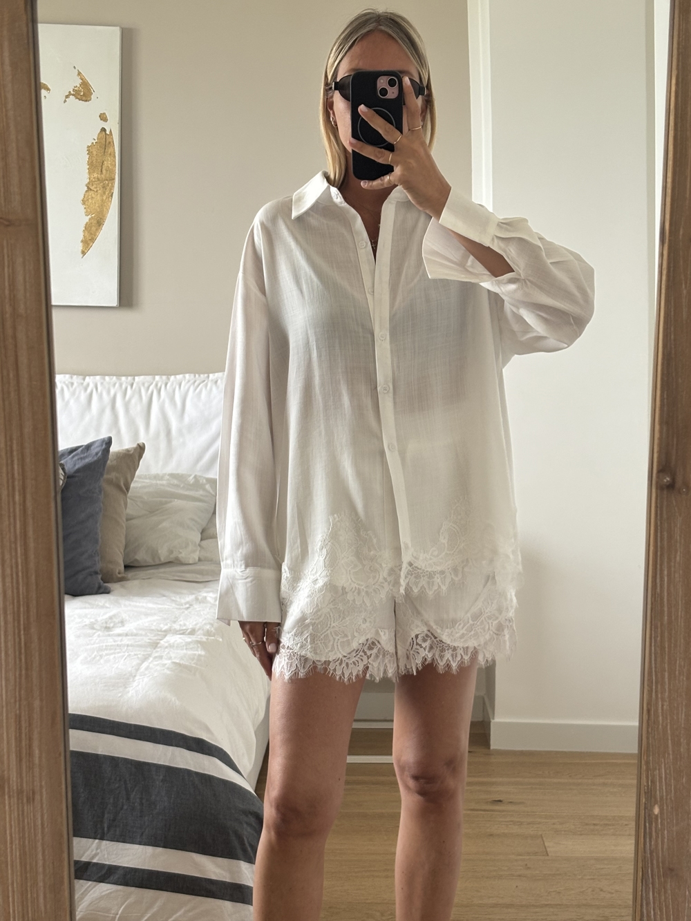 Camicia con collo e maniche lunghe con abbottonatura frontale con bottoni e dettaglio finale con pizzo delicato.
