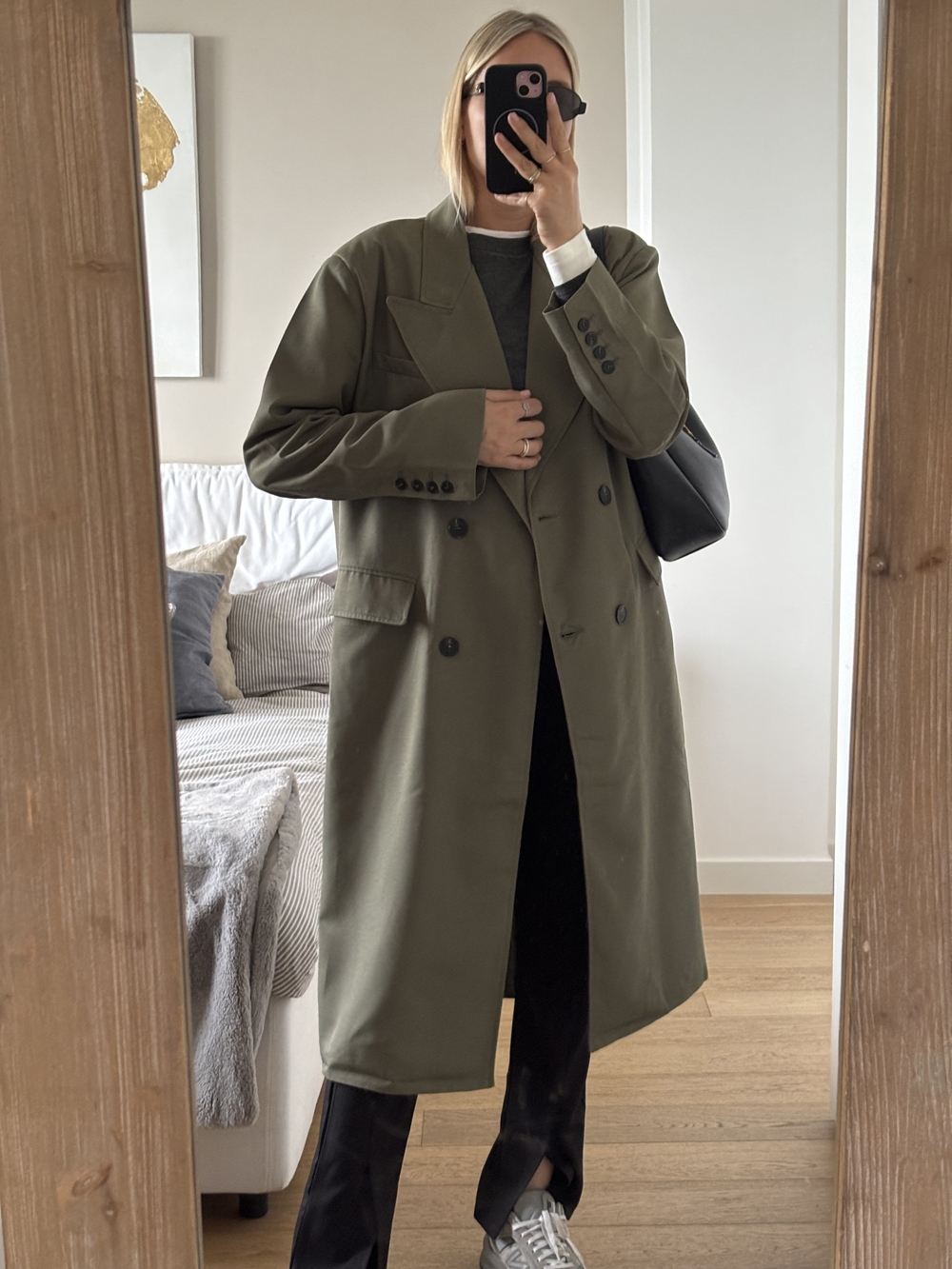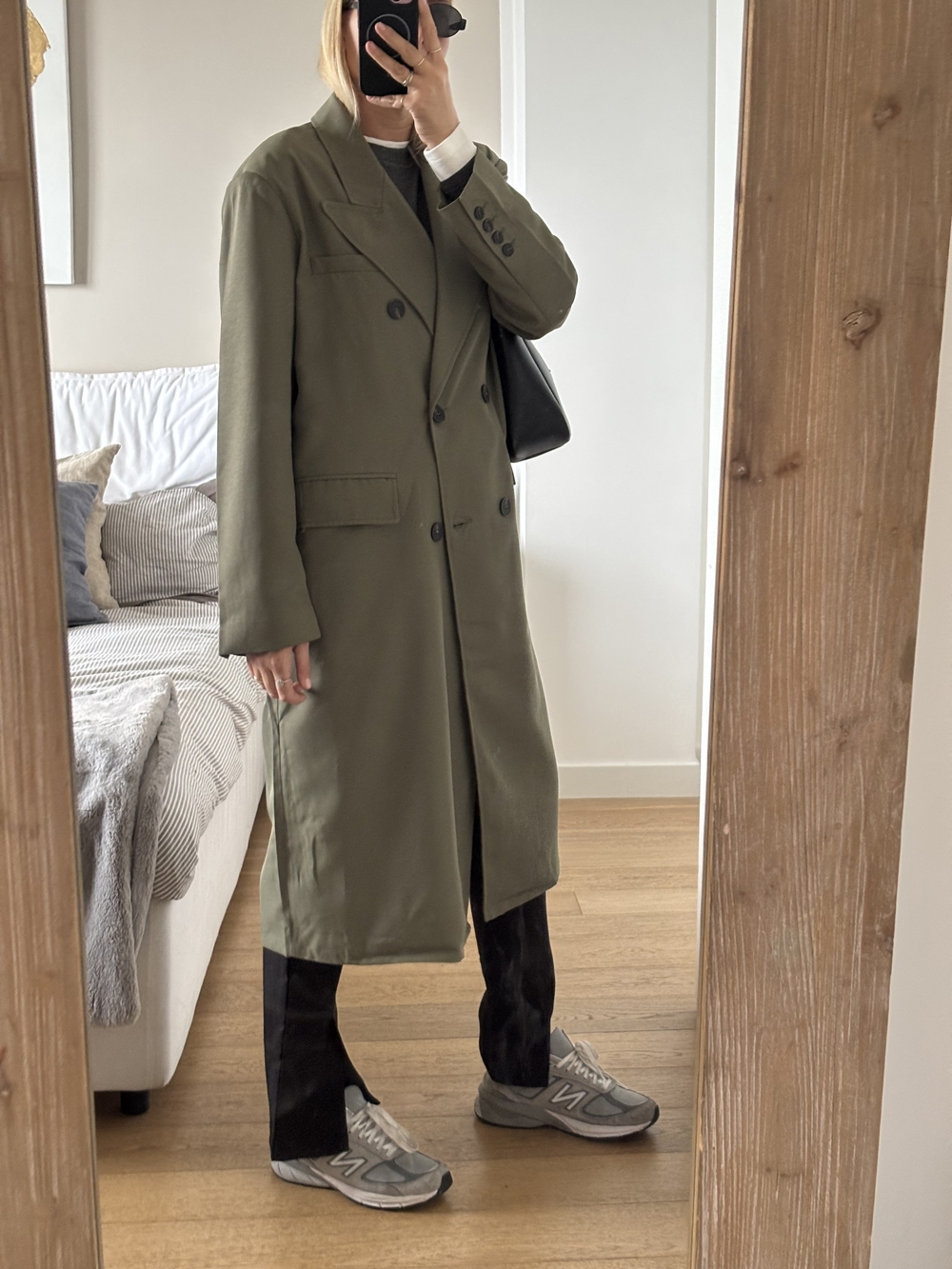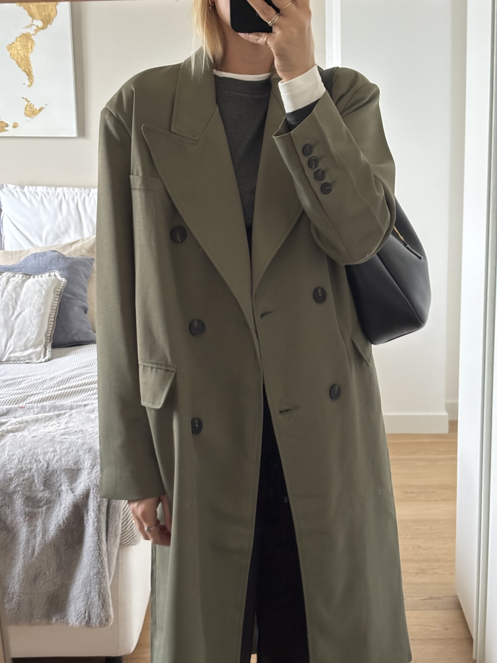 Trench con collo a reverse e abbottonatura a doppiopetto e tasche laterali con patta.