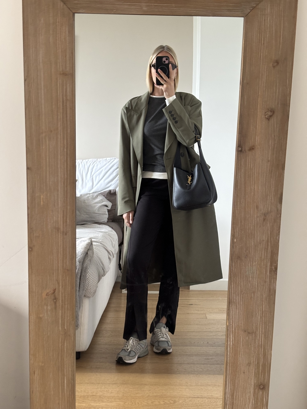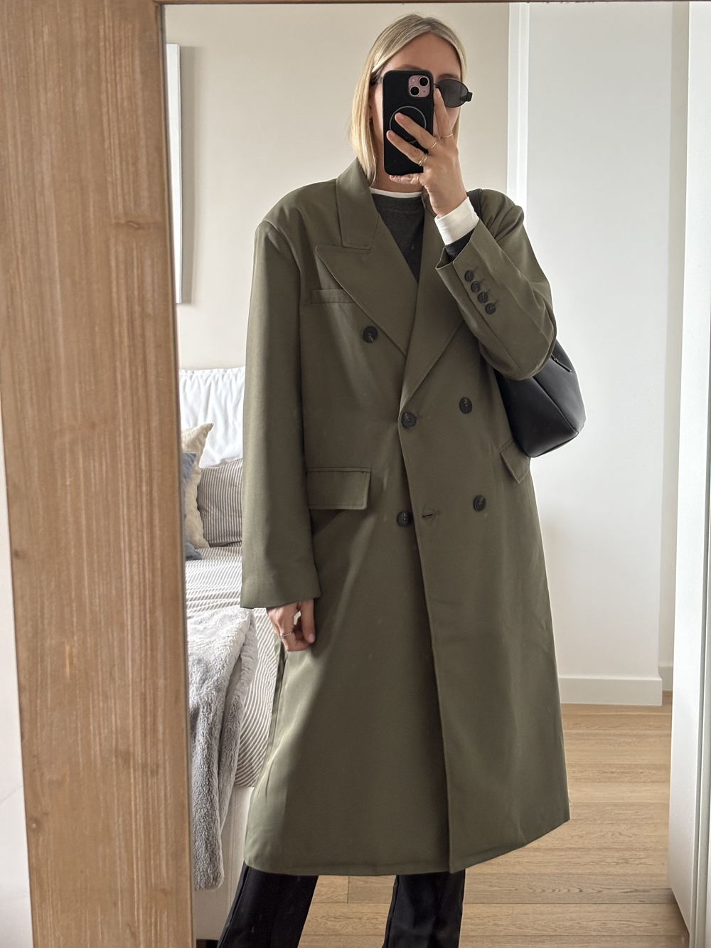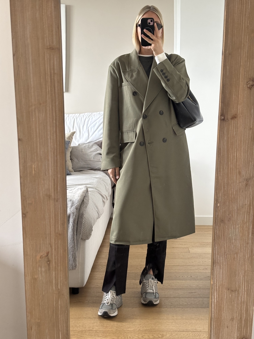 Trench con collo a reverse e abbottonatura a doppiopetto e tasche laterali con patta.