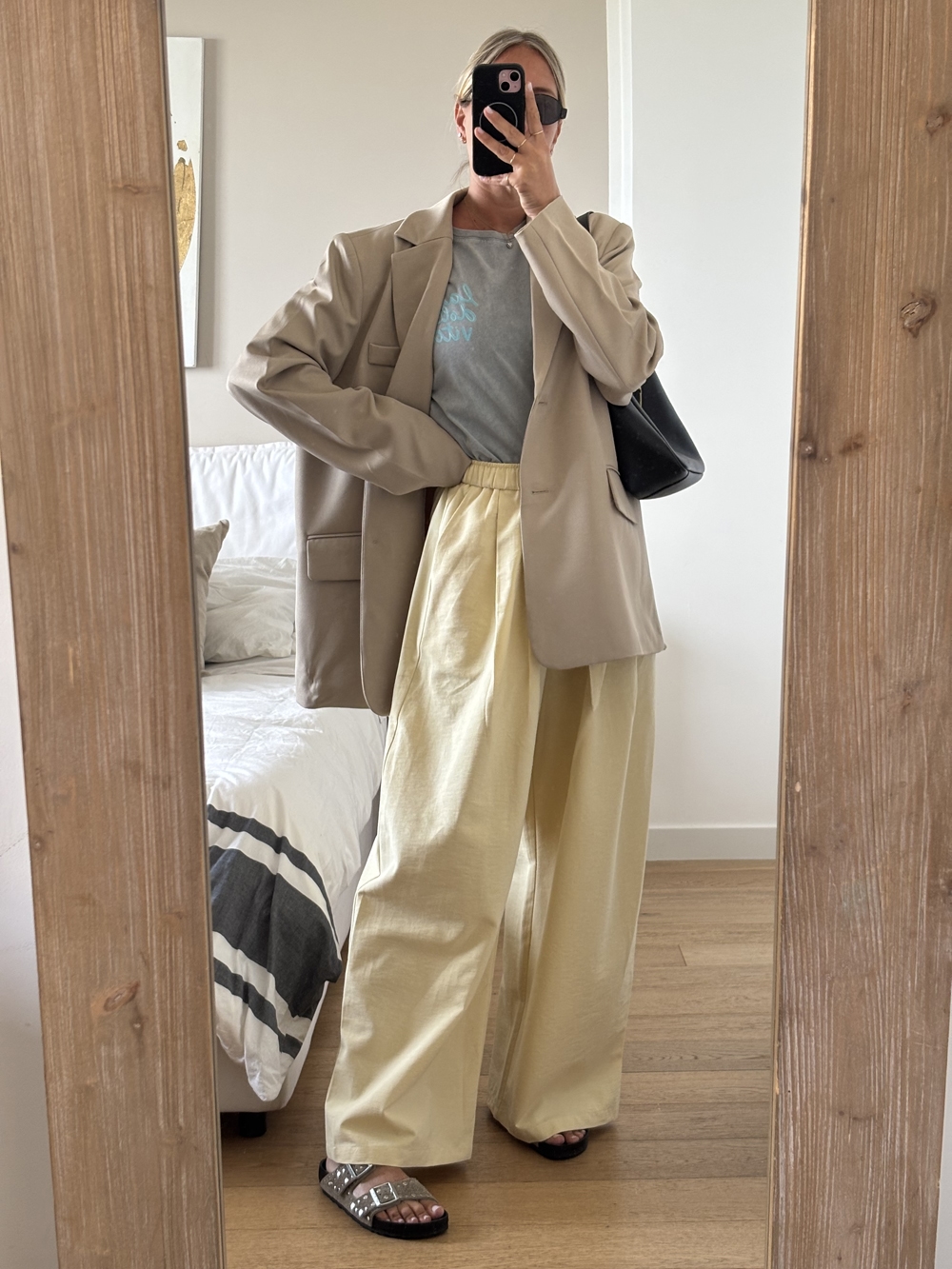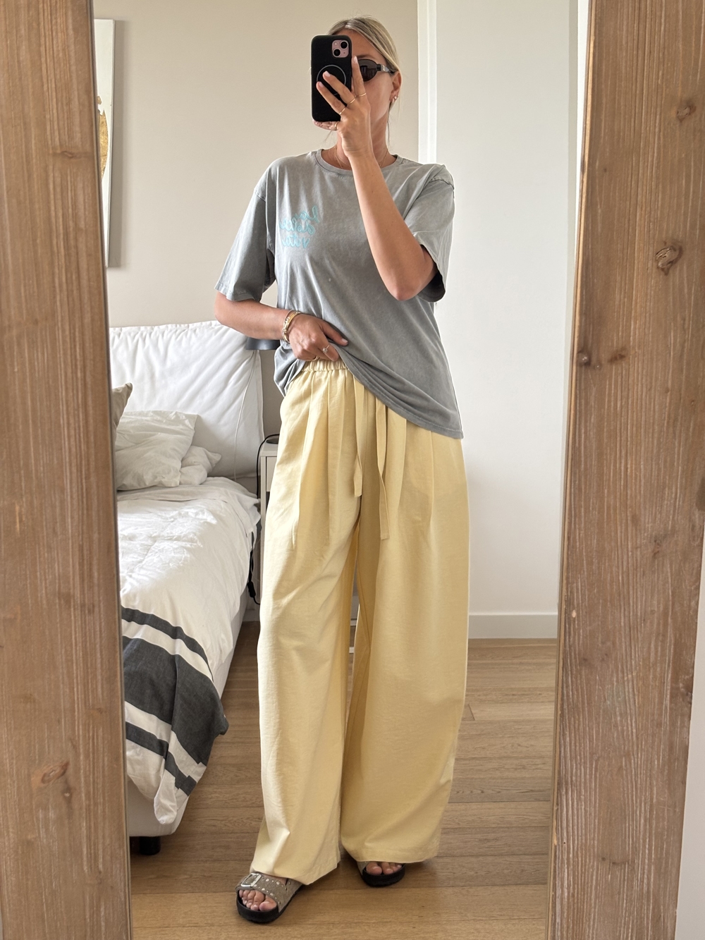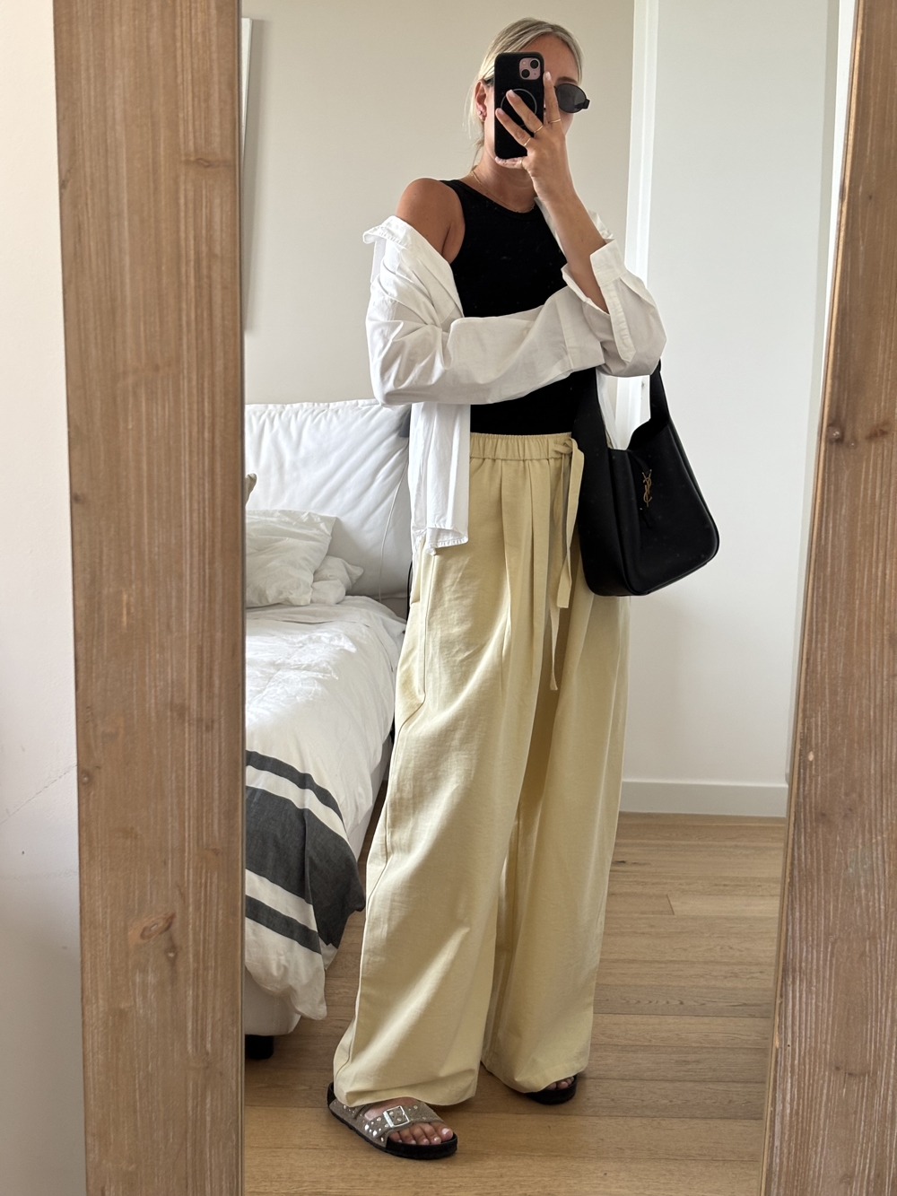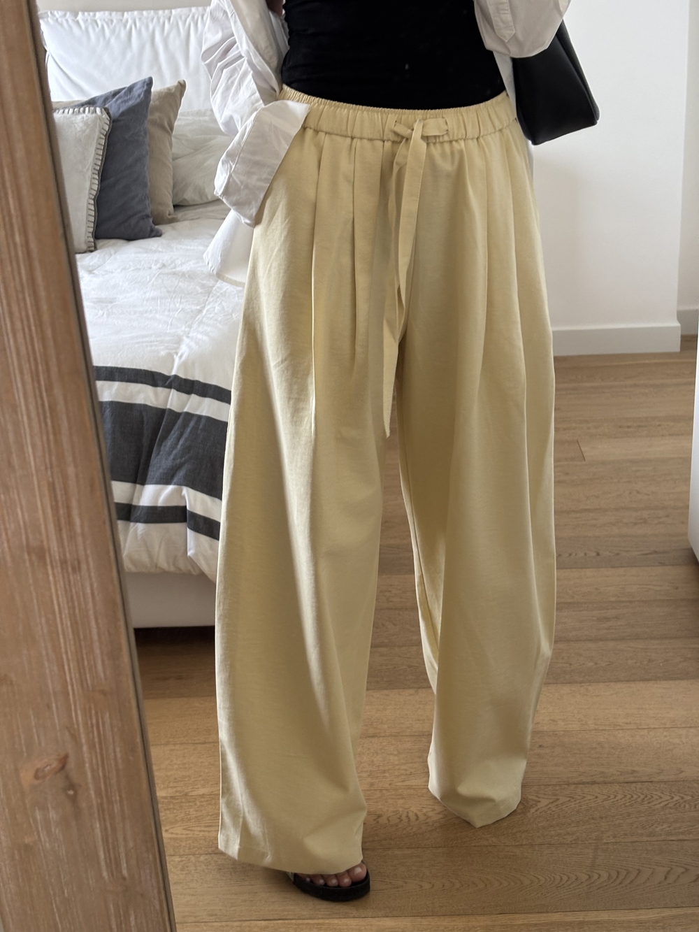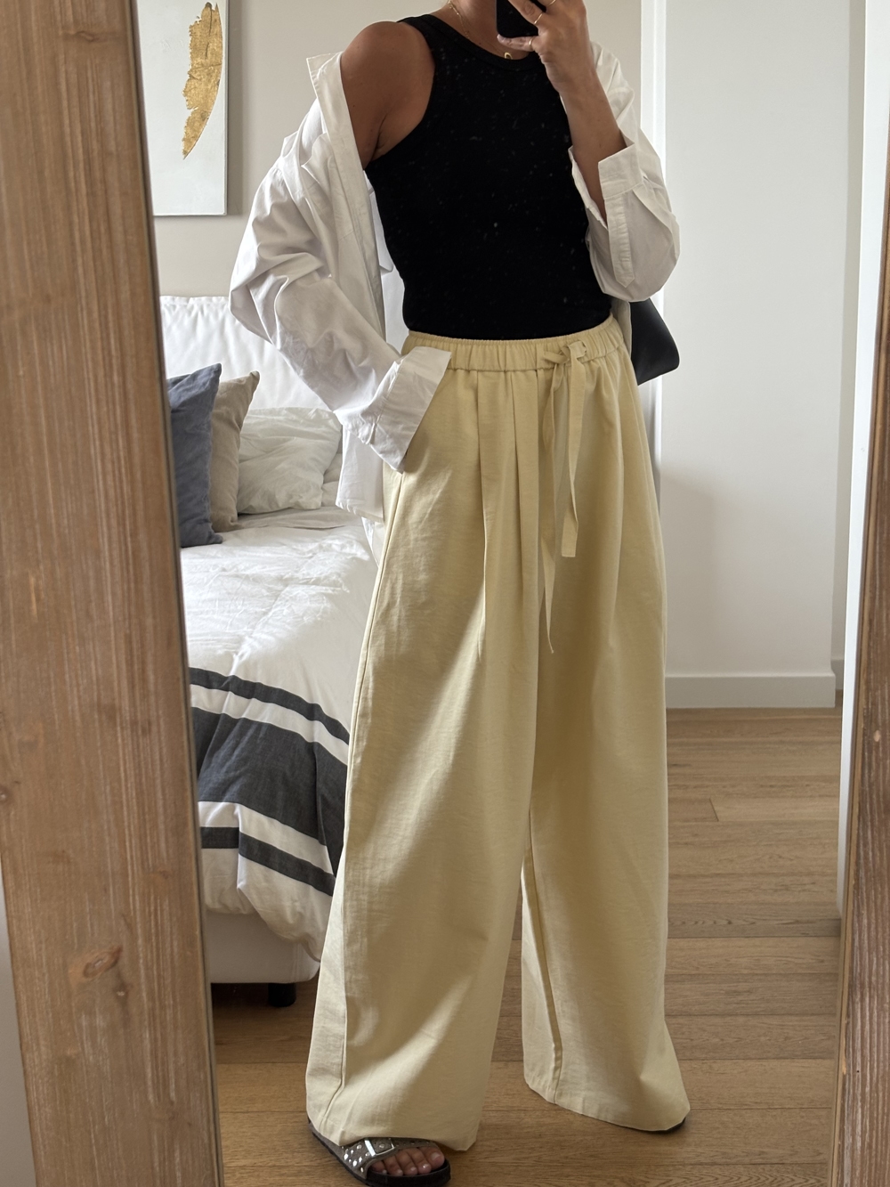Pantalone gamba larga con elastico in vita e tasche laterali.