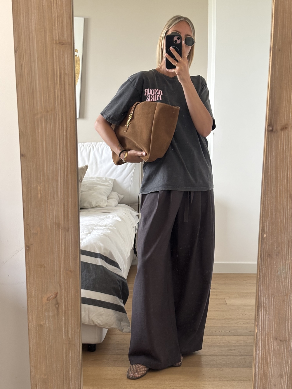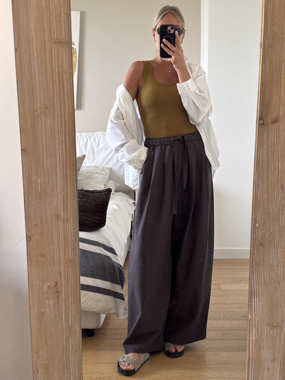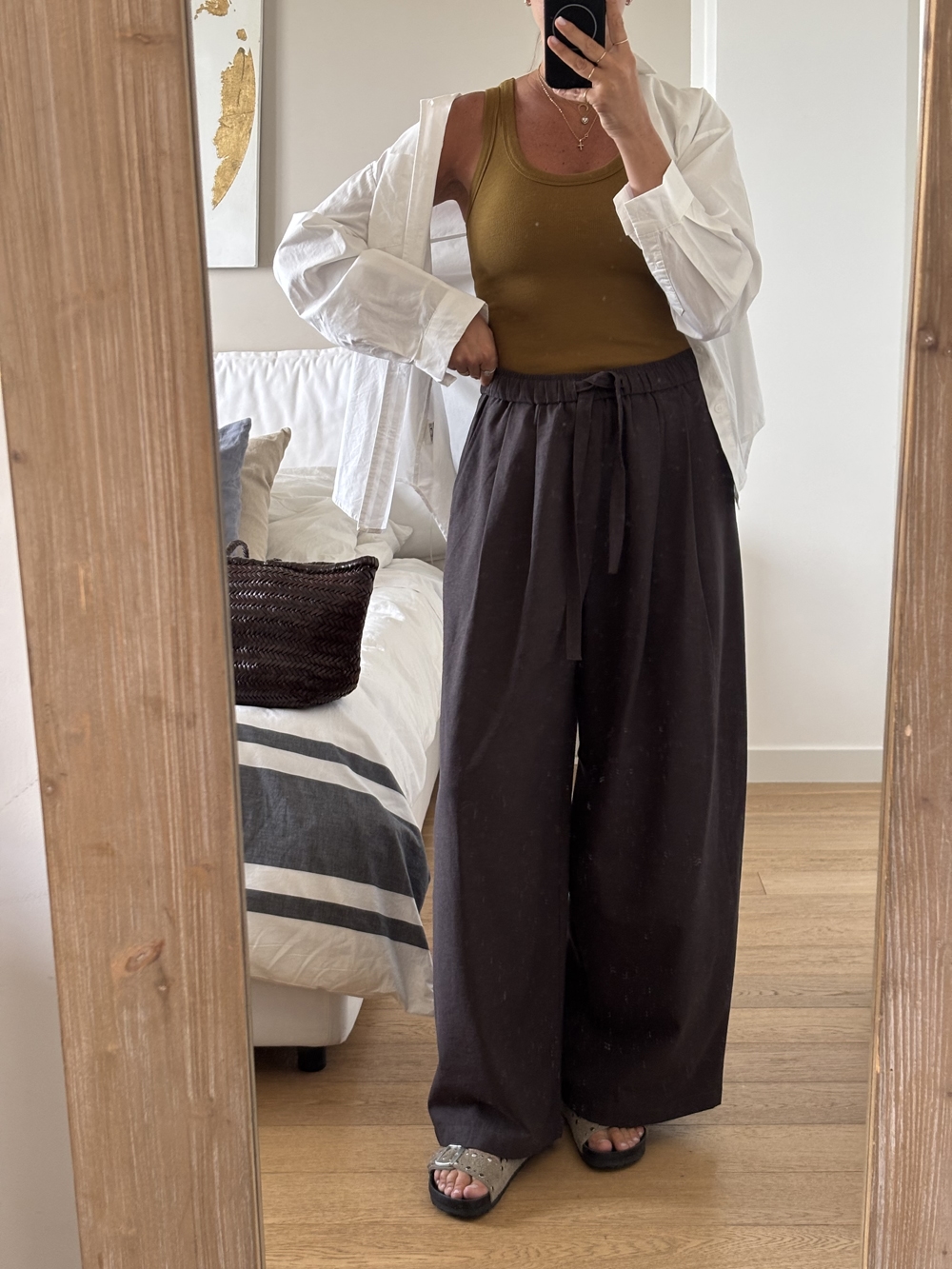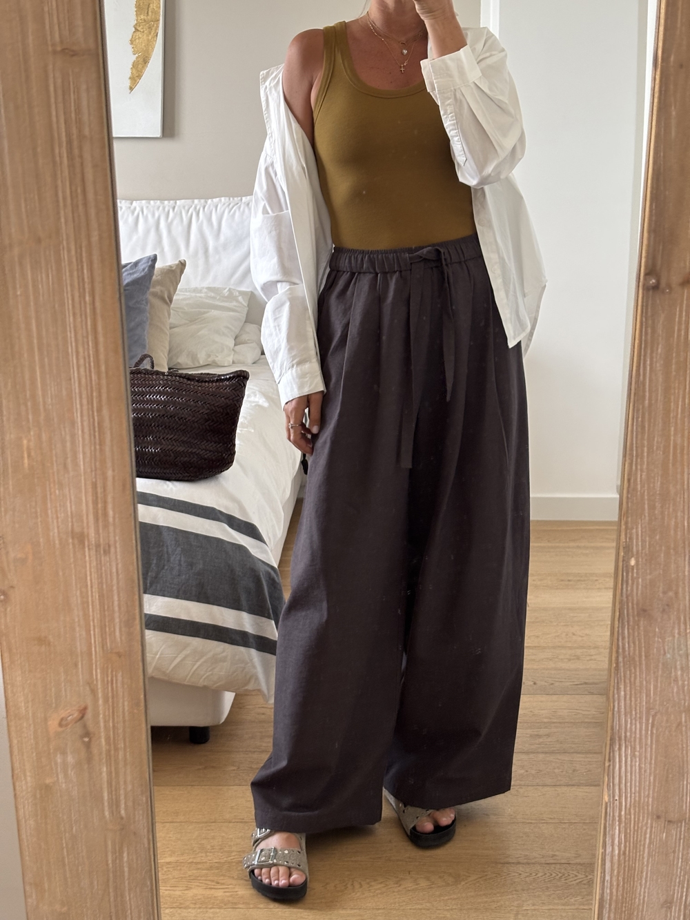 Pantalone gamba larga con elastico in vita e tasche laterali.